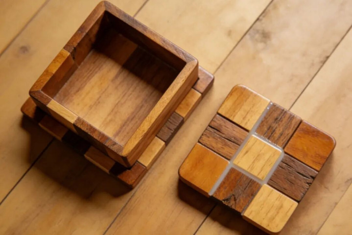 旧木桌腿、边角料切割成小块,用环保胶拼接成杯垫、收纳盒底座,涂木蜡油防潮,实用又好看。